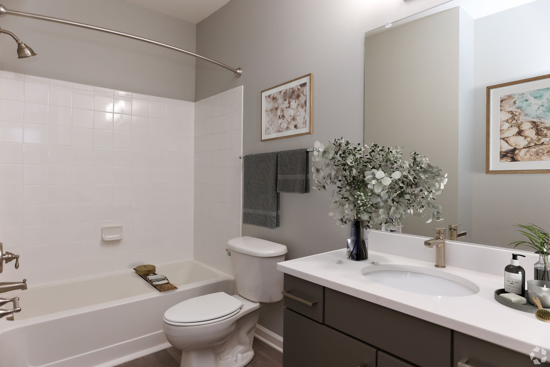 Bright apartment bathroom with a wood vanity, white countertop, and striped shower curtain.
