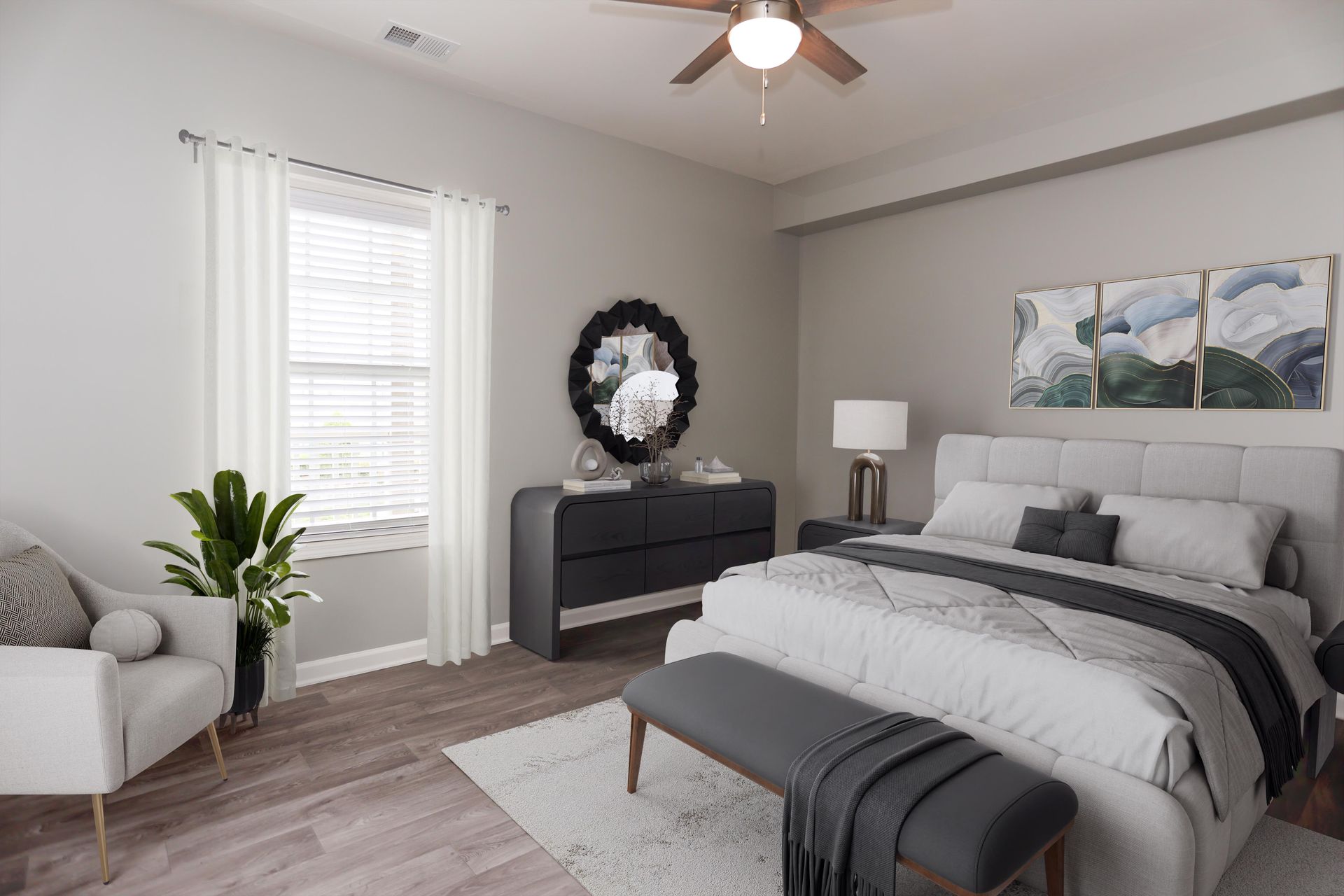 Cozy apartment bedroom showcasing modern furnishings, a round mirror, and natural light.