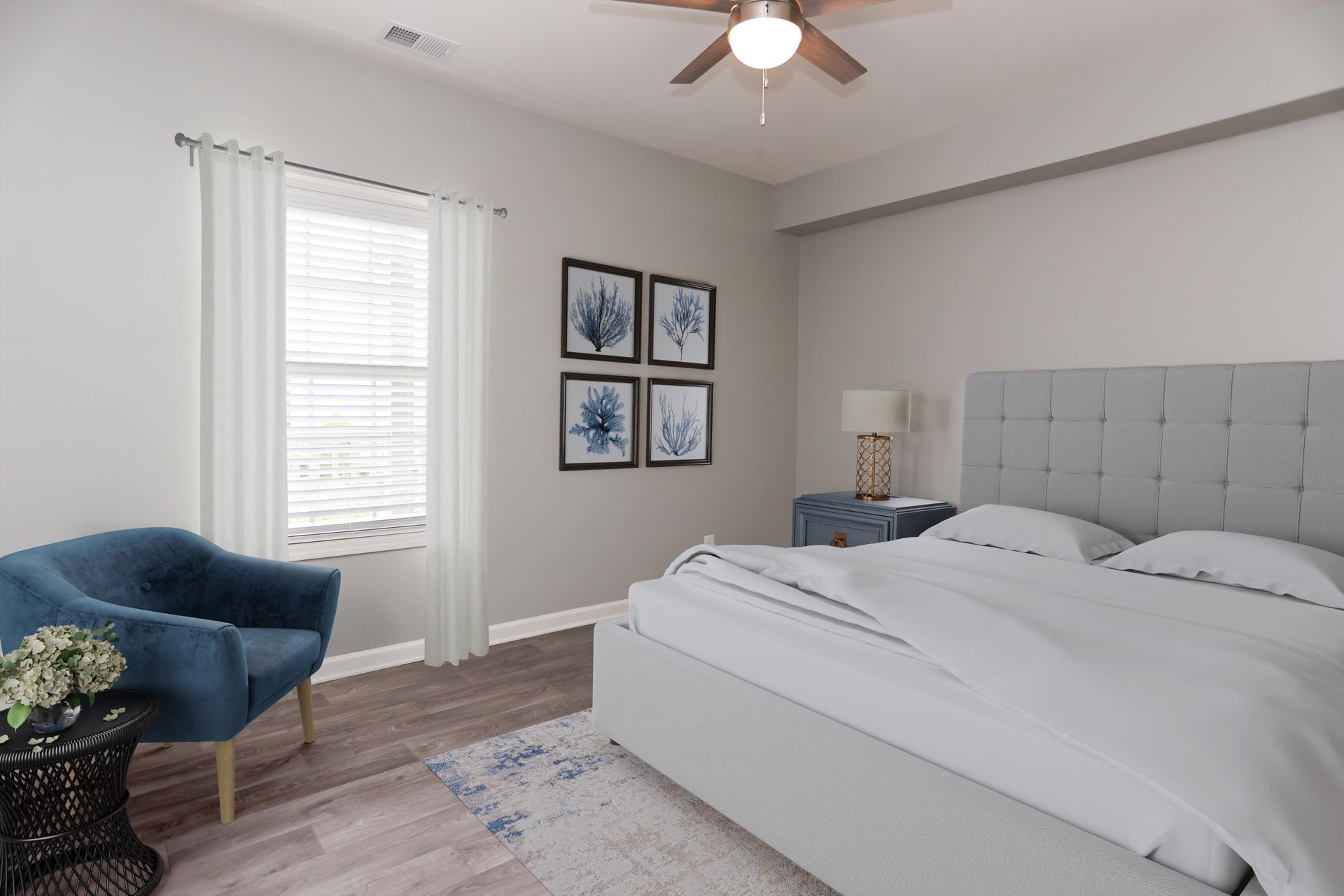 Contemporary apartment bedroom with a blue duvet, upholstered headboard, and matching nightstands for a cozy retreat.