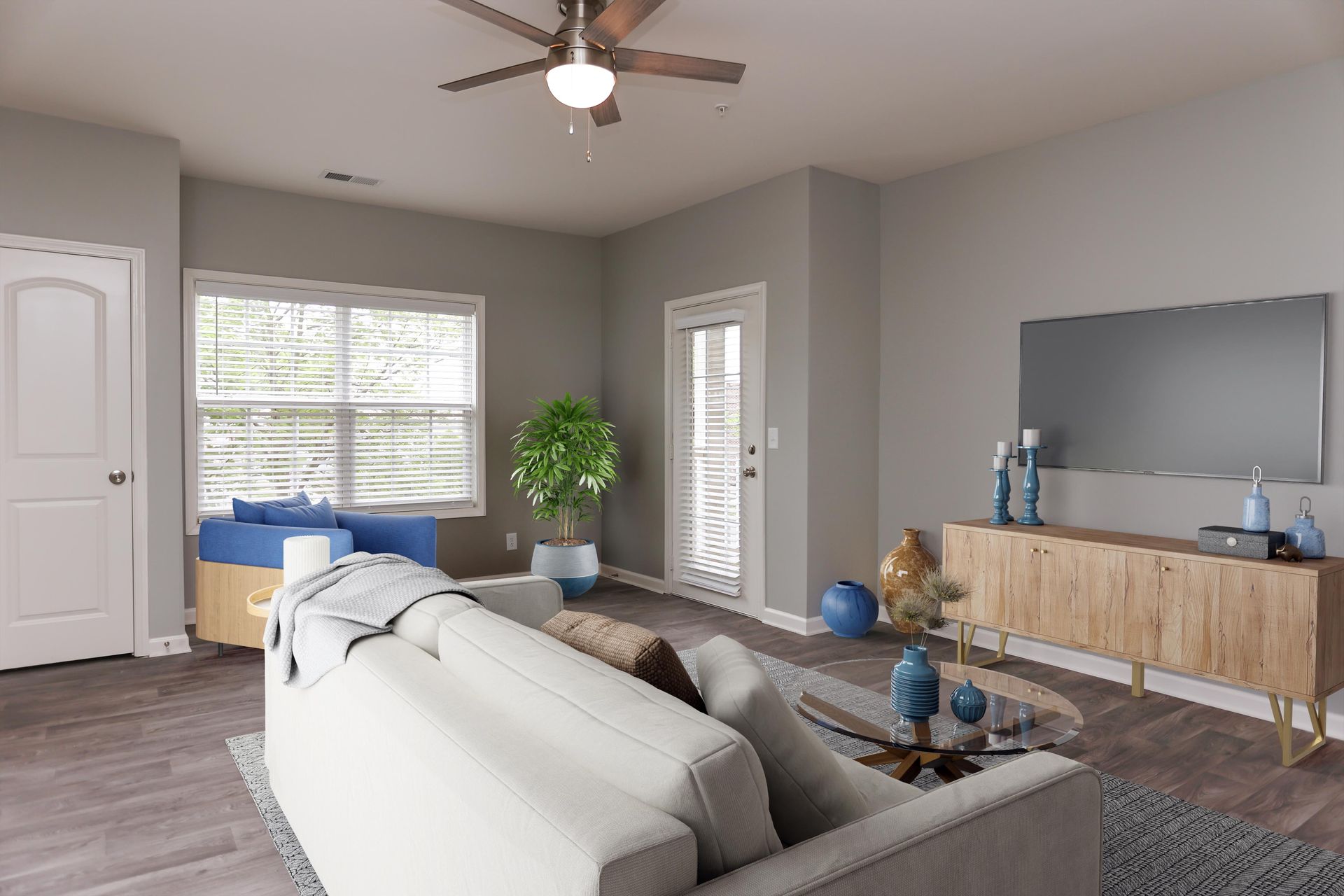 Bright, modern apartment living room with wood floors and contemporary furniture.